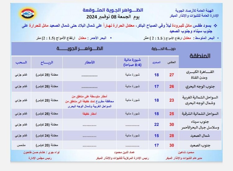 قالت هيئة الأرصاد الجوية إنها تتوقع أن يشهد الطقس طقس مائل للبرودة ليلا وفى الصباح الباكر، معتدل نهارا على شمال البلاد حتى شمال الصعيد ، مائل للحرارة على جنوب سيناء وجنوب البلاد.
