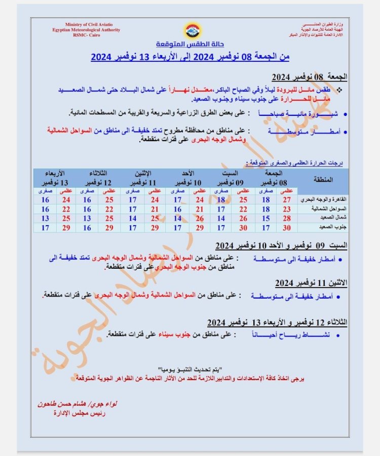 ولفت إلى أنه من المتوقع اليوم تأثر البلاد بشبورة مائية صباحا على بعض الطرق الزراعية والسريعة والقريبة من المسطحات المائية المؤدية من وإلى القاهرة الكبرى والوجه البحرى والسواحل الشمالية ومدن القناة ووسط سيناء وشمال الصعيد.