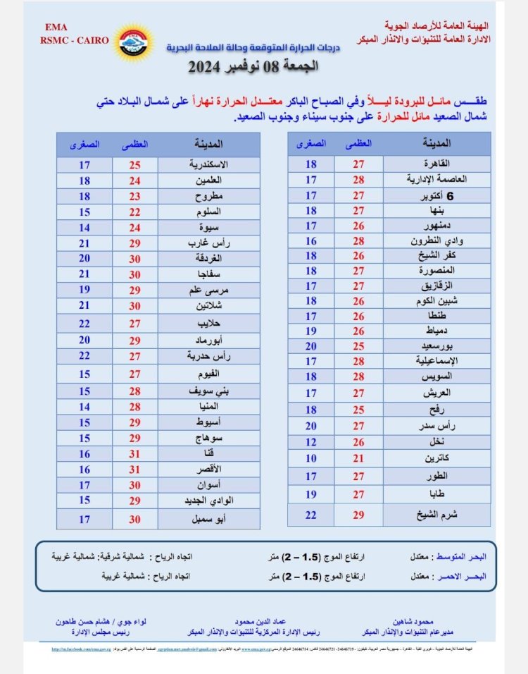 درجات الحرارة المتوقعة اليوم الجمعة 8 نوفمبر 2024: القاهرة العظمى 27 درجة والصغرى 18 والإسكندرية العظمى 25 والصغرى 17، ومطروح العظمى 23 درجة والصغرى 18، وسوهاج العظمى 29 درجة، والصغرى 15، وقنا العظمى 31 درجة والصغرى 16، وأسوان العظمى 30 درجة والصغرى 17 درجة.