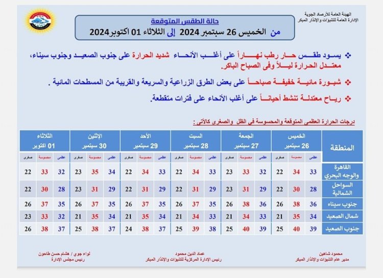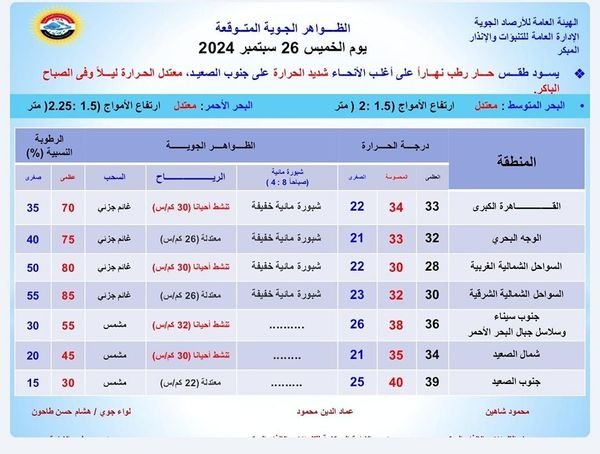 درجات الحرارة المتوقعة اليوم الخميس 26 سبتمبر 2024: القاهرة العظمى 33 درجة والمحسوسة 34 والصغرى 22، والإسكندرية العظمى 29 والمحسوسة 31 والصغرى 22، ومطروح العظمى 28 درجة والمحسوسة 30 والصغرى 21، وسوهاج العظمى 36 درجة والمحسوسة 37 والصغرى 23، وقنا العظمى 39 درجة والمحسوسة 40 والصغرى 24، وأسوان العظمى 40 درجة والمحسوسة 41 والصغرى 24.