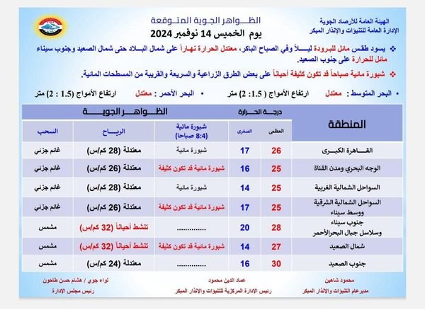قالت هيئة الأرصاد الجوية إنها تتوقع أن يكون الطقس اليوم الخميس مائل للبرودة ليلا وفى الصباح الباكر، معتدل نهارا على شمال البلاد حتى شمال الصعيد وجنوب سيناء ، مائل للحرارة على جنوب البلاد.
