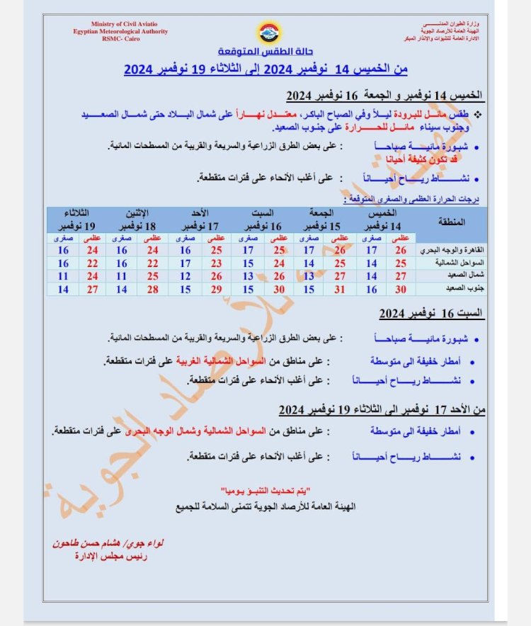 وأشار الدكتور محمود شاهين، مدير عام إدارة التنبؤات الجوية والإنذار المبكر بمخاطر الطقس، إلى أنه من المتوقع اليوم تأثر البلاد بـ شبورة مائية صباحا قد تكون كثيفة أحيانا على بعض الطرق الزراعية والسريعة والقريبة من المسطحات المائية المؤدية من وإلى القاهرة الكبرى والوجه البحرى والسواحل الشمالية ومدن القناة ووسط سيناء وشمال الصعيد.