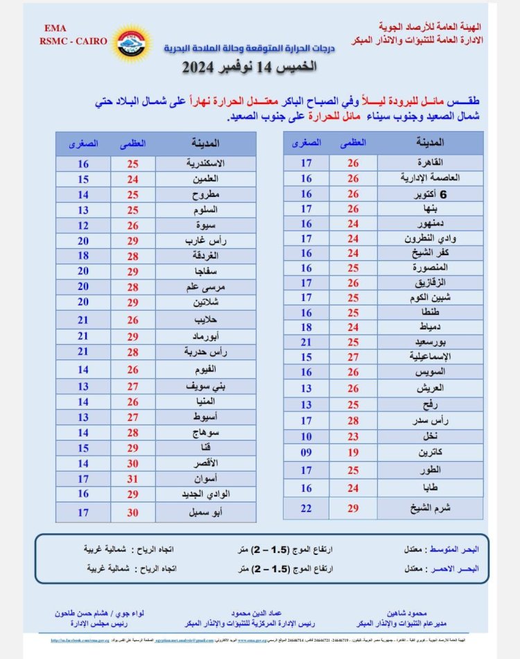 درجات الحرارة المتوقعة الخميس 14 نوفمبر 2024: القاهرة العظمى 26 درجة والصغرى 17، والإسكندرية العظمى 25 والصغرى 16، ومطروح العظمى 25 درجة والصغرى 14، وسوهاج العظمى 28 درجة، والصغرى 14، وقنا العظمى 29 درجة والصغرى 15، وأسوان العظمى 31 درجة والصغرى 17.