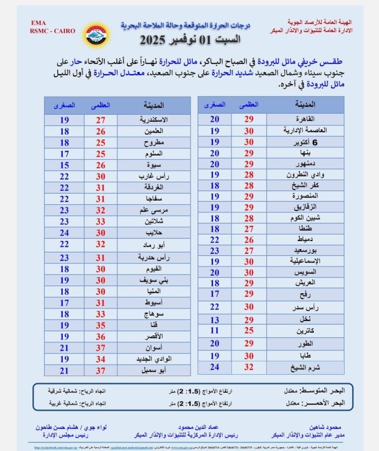 درجات الحرارة اليوم السبت 1 نوفمبر 2025 : الطقس فى القاهرة العظمى 29 درجة والصغرى 20 درجة. الإسكندرية العظمى 27 درجة والصغرى 19 درجة.مطروح العظمى 25 درجة والصغرى 18 درجة.سوهاج العظمى 33 درجة والصغرى 18 درجة. قنا العظمى 35 درجة والصغرى 19 درجة.أسوان العظمى 37 درجة والصغرى 21 درجة.