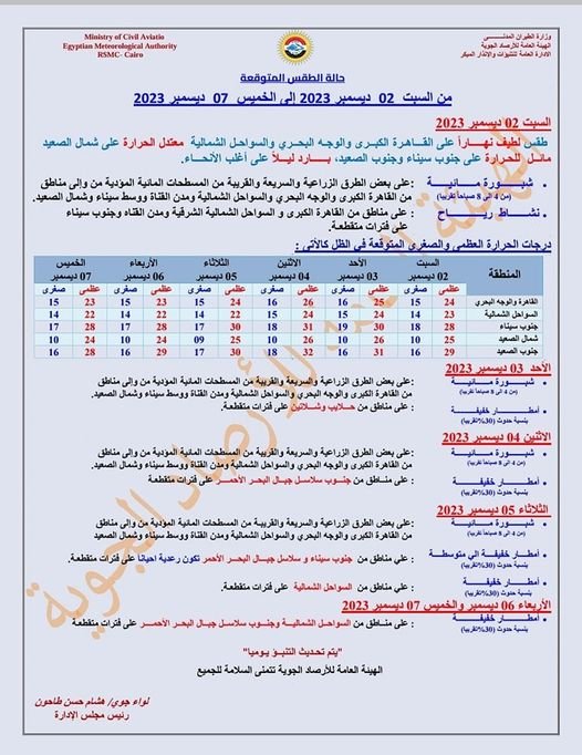 قالت هيئة الأرصاد الجوية إنها تتوقع أن يشهد اليوم السبت، طقس لطيف نهارا على القاهرة الكبرى والوجه البحرى والسواحل الشمالية، معتدل على شمال الصعيد، مائل للحرارة على جنوب سيناء وجنوب البلاد، مائل للبرودة ليلا على أغلب الأنحاء.