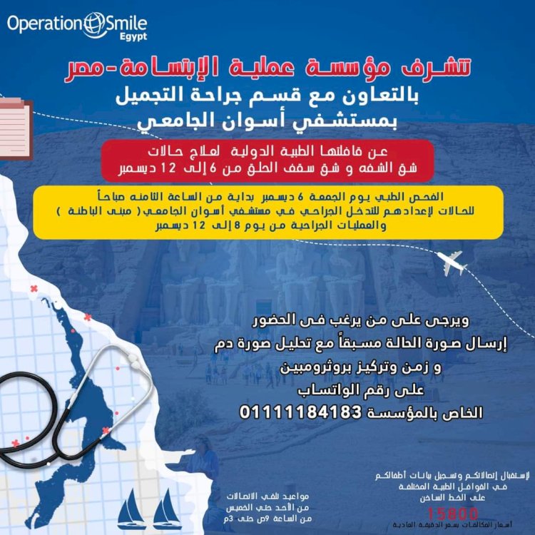 إضافة إلي أنه تم تحديد مواعيد الكشف يوم ٦ ديسمبر فقط لتحضير الحالات تمهيدا لإجراء العمليات الجراحية بقسم الجراحة والتجميل بمستشفيات جامعة أسوان