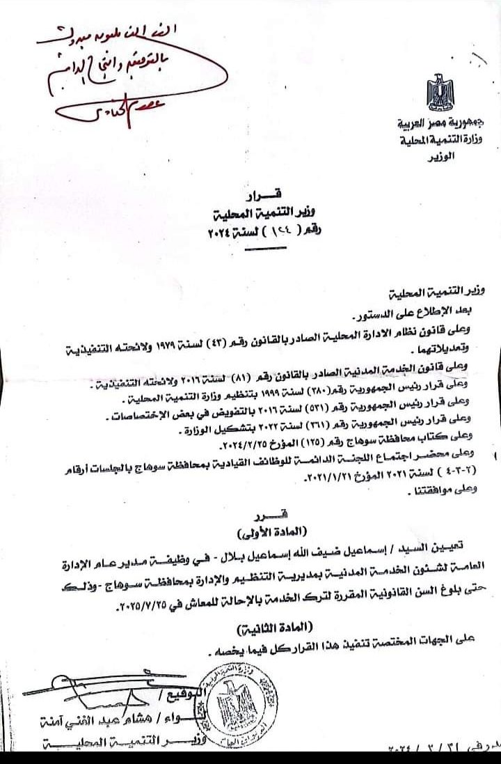 *أصدر اللواء هشام آمنة وزير التنمية المحلية القرار رقم ١٢٤ لسنة ٢٠٢٤ بتعيين إسماعيل ضيف الله إسماعيل فى وظيفة مدير عام الإدارة العامة لشئون الخدمة المدنية بمديرية التنظيم والإدارة بمحافظة سوهاج، وذلك حتى بلوغ السن القانونية المقررة لترك الخدمة بالإحالة للمعاش فى ٢٠٢٥/٧/٢٥م