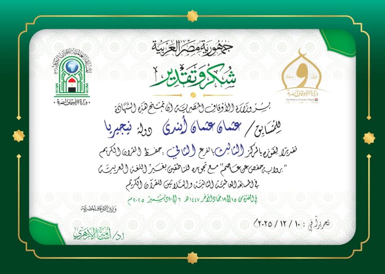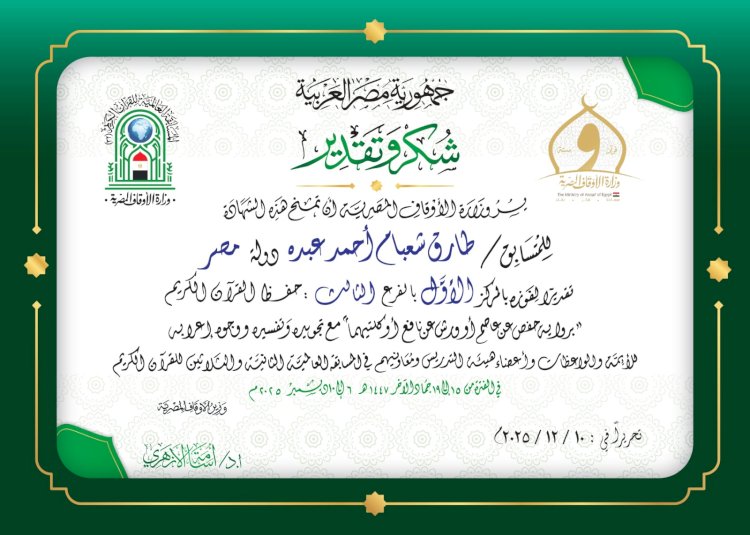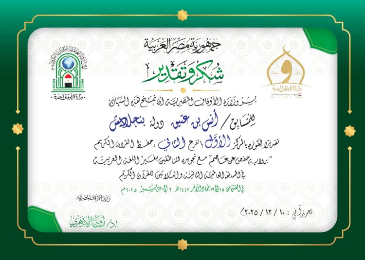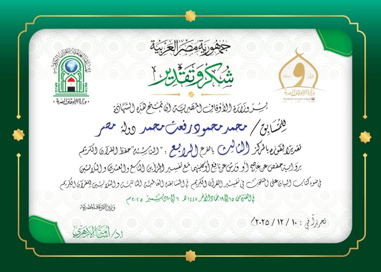 اكدت وزارة الاوقاف انه تم منح شهادات التقدير للفائزين في المسابقة العالمية للقرآن الكريم في نسختها الثانية والثلاثين ١٤٤٧ هجرية/٢٠٢٥ ميلادية (المجموعة الأولى) عبرت الوزارة عن فخرها واعتزازها بمنح الشهادات قائلة بعين التقدير منحناها… وبيد أمهر الخطاطين كتبناها… وبخالص الدعوات أتبعناها…