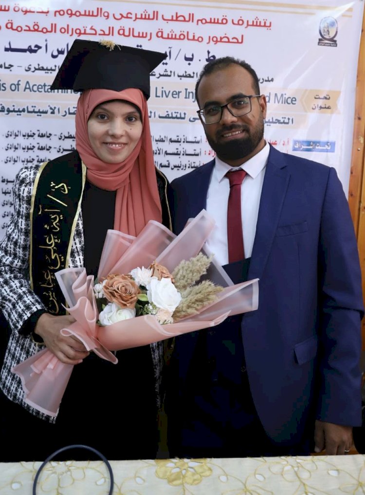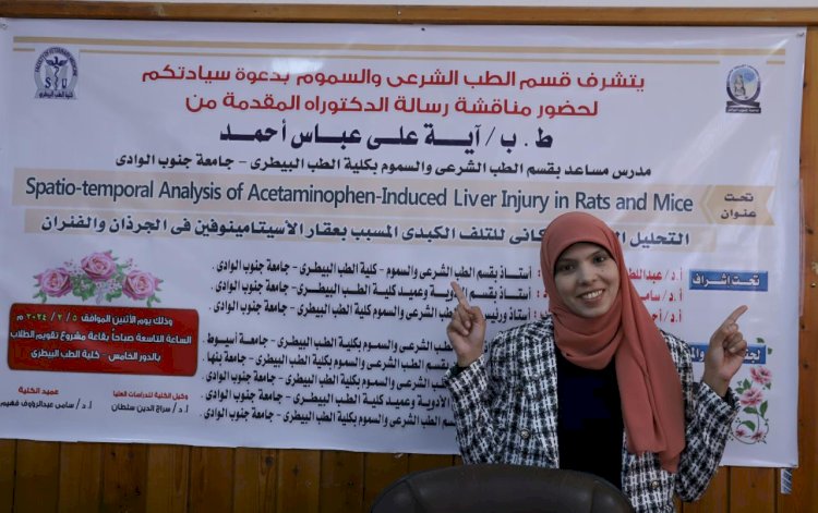 حصلت الباحثة ط.ب / آية على عباس أحمد، الاستاذ المساعد بقسم الطب الشرعي والسموم بكلية الطب البيطري بجامعة جنوب الوادي، على درجة الدكتوراة من قسم الطب الشرعي والسموم بالكلية، عن موضوع رسالتها المعنونة: "التحليل الزمني والمكاني للتلف الكبدي المسبب بعقار الأسيتامينوفين في الجرذان والفئران ".