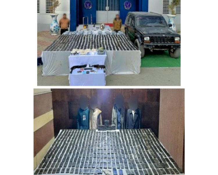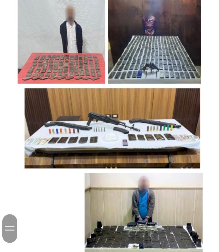 من المواد المخدرة المتنوعة "حشيش ، هيدرو ، هيروين ، آيس ، بودر" - 78 قطعة سلاح نارى "19 بندقية آلية ، 47 بندقية خرطوش ، 12 فرد خرطوش").. هذا وتقدر القيمة المالية للمواد المخدرة المضبوطة قرابة (75) مليون جنيه. تم إتخاذ الإجراءات القانونية.