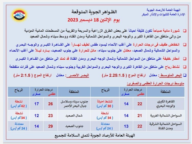 وبالنسبة لدرجات الحرارة اليوم الاثنين 18 ديسمبر
