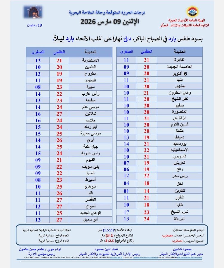 درجات الحرارة اليوم الأثنين 9 مارس 2026:القاهرة العظمى 21 درجة والصغرى 11 درجات. الإسكندرية العظمى 21 درجة والصغرى 12 درجة. مطروح العظمى 19 درجة والصغرى 13 درجة. سوهاج العظمى 25 درجة والصغرى 10 درجات. قنا العظمى 26 درجة والصغرى 11 درجة فى أسوان العظمى 27 درجة والصغرى 13 درجة
