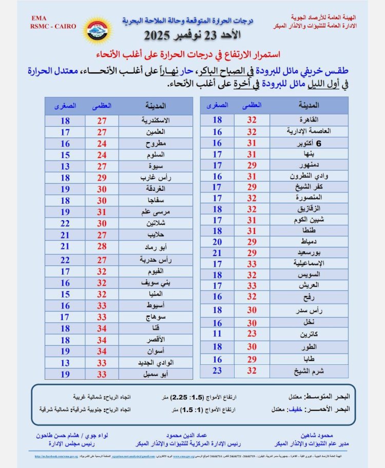 درجات الحرارة اليوم الأحد 23 نوفمبر 2025 :القاهرة العظمى 32 درجة والصغرى 18 درجة. الإسكندرية العظمى 27 درجة والصغرى 18 درجة. مطروح العظمى 24 درجة والصغرى 16 درجة. سوهاج العظمى 33 درجة والصغرى 17 درجة. قنا العظمى 34 درجة والصغرى 18 درجة. فى أسوان العظمى 34 درجة والصغرى 19 درجة.