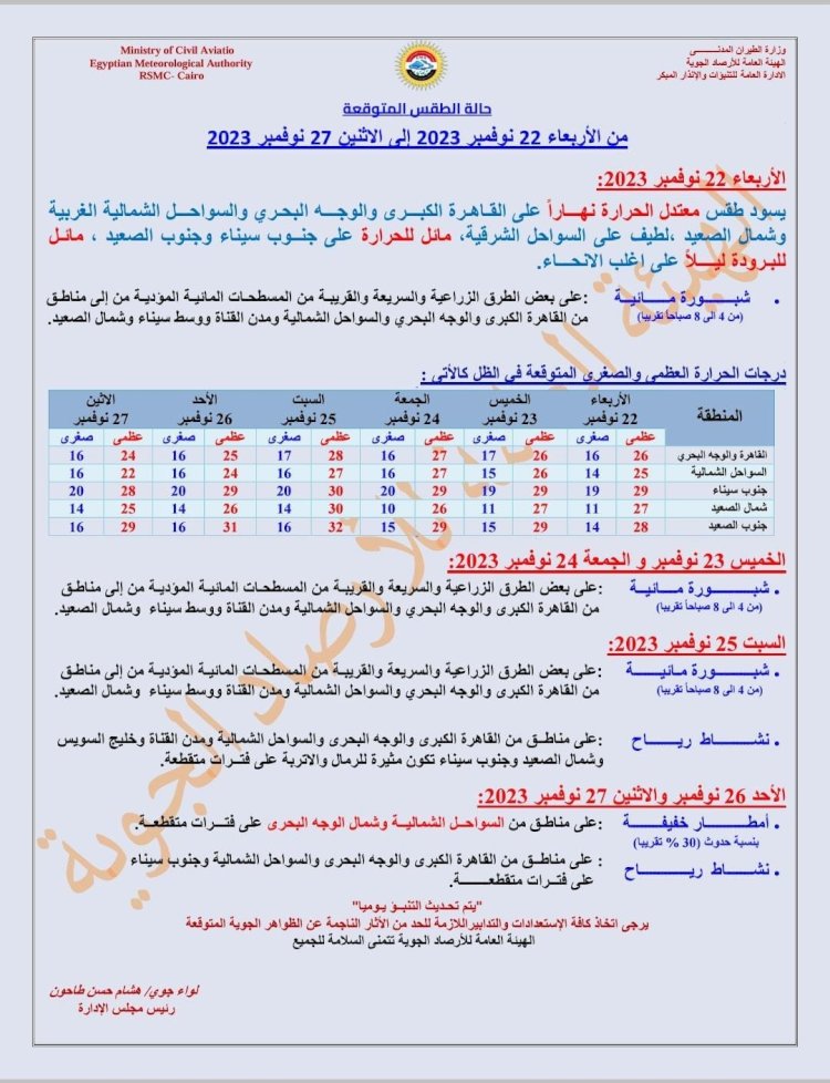 وبالنسبة لدرجات الحرارة اليوم الأربعاء 22 نوفمبر 2023 : القاهرة العظمى 26 درجة والصغرى 16، والإسكندرية العظمى 25 والصغرى 15، ومطروح العظمى 26 درجة والصغرى 14، وسوهاج العظمى 27 درجة والصغرى 13، وقنا العظمى 27 درجة والصغرى 14، وأسوان العظمى 28 درجة والصغرى 14.
