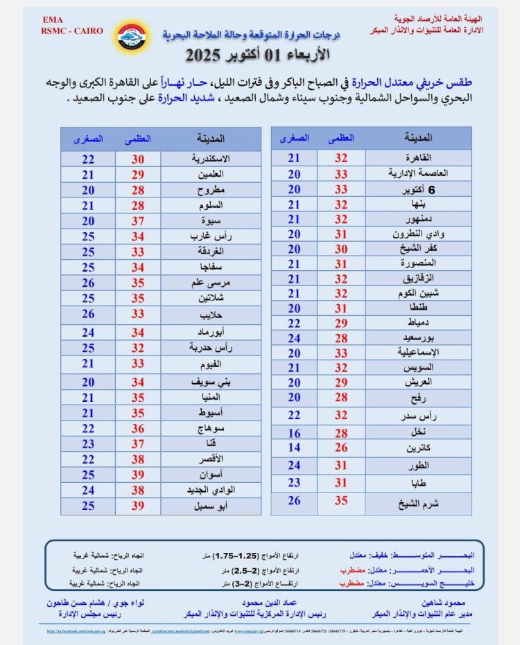 درجات الحرارة اليوم الأربعاء 1 أكتوبر 2025 :  القاهرة العظمى 32 درجة والصغرى 21 درجة. الإسكندرية العظمى 30 درجة والصغرى 22 درجة. مطروح العظمى 28 درجة والصغرى 20 درجة.سوهاج العظمى 36 درجة والصغرى 22 درجة. قنا العظمى 37 درجة والصغرى 23 درجة. أسوان العظمى 39 درجة والصغرى 25 درجة.