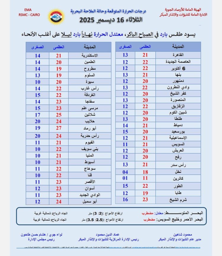 درجات الحرارة اليوم الثلاثاء 16 ديسمبر 2025 :القاهرة العظمى 21 درجة والصغرى 13 درجة. الإسكندرية العظمى 21 درجة والصغرى 14 درجة. مطروح العظمى 19 درجة والصغرى 14 درجة. سوهاج العظمى 22 درجة والصغرى 11 درجة. قنا العظمى 22 درجة والصغرى 10 درجة. فى أسوان العظمى 23 درجة والصغرى 12 درجة.