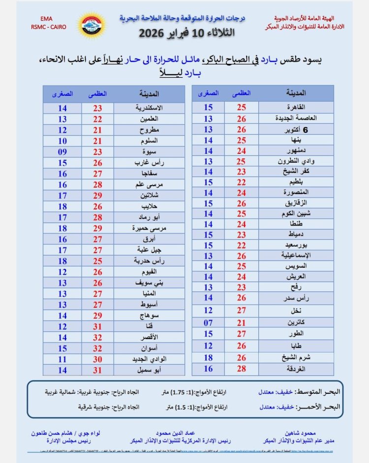 درجات الحرارة اليوم الثلاثاء 10 فبراير 2026:القاهرة العظمى 25 درجة والصغرى 15 درجة. الإسكندرية العظمى 23 درجة والصغرى 14 درجة. مطروح العظمى 21 درجة والصغرى 12 درجة. سوهاج العظمى 29 درجة والصغرى 14 درجة. قنا العظمى 31 درجة والصغرى 12 درجة. فى أسوان العظمى 32 درجة والصغرى 15 درجة.