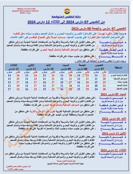 وبالنسبة لدرجات الحرارة الخميس 7 مارس 2024: القاهرة العظمى 22 درجة والصغرى 13، والإسكندرية العظمى 21 والصغرى 12، ومطروح العظمى 20 درجة والصغرى 12، وسوهاج العظمى 27 درجة والصغرى 13، وقنا العظمى 28 درجة والصغرى 13، وأسوان العظمى 29 درجة والصغرى 14.