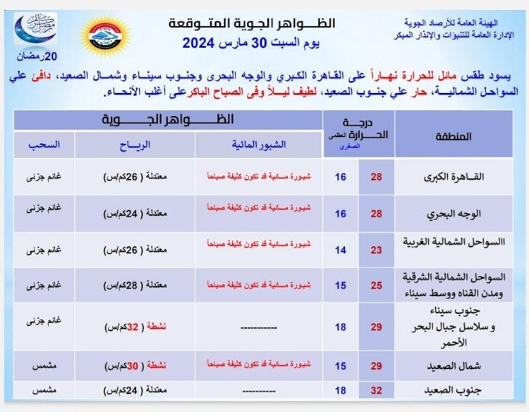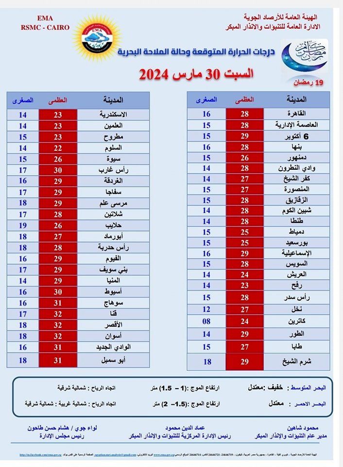 وبالنسبة لدرجات الحرارة اليوم السبت30 مارس 2024: القاهرة العظمى 28 درجة والصغرى 16، والإسكندرية العظمى 23 والصغرى 14، ومطروح العظمى 23 درجة والصغرى 15، وسوهاج العظمى 31 درجة والصغرى 16، وقنا العظمى 32 درجة والصغرى 17، وأسوان العظمى 32 درجة والصغرى 18.