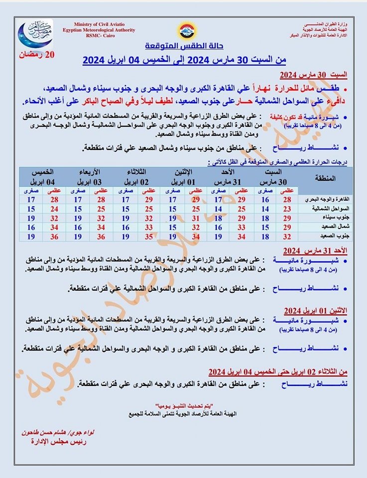 قالت هيئة الأرصاد الجوية إنها تتوقع أن يشهد اليوم السبت طقس مائل للحرارة نهاراً على القاهرة الكبرى والوجه البحرى وجنوب سيناء وشمال الصعيد، دافئ على السواحل الشمالية، حار على جنوب البلاد، لطيف ليلا على أغلب الأنحاء وفي الصباح الباكر.