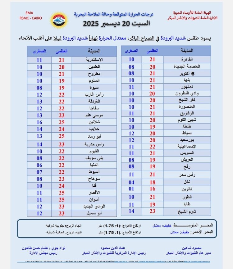 درجات الحرارة اليوم السبت 20 ديسمبر 2025 :القاهرة العظمى 21 درجة والصغرى 10 درجة. الإسكندرية العظمى 21 درجة والصغرى 11 درجة. مطروح العظمى 21 درجة والصغرى 10 درجة. سوهاج العظمى 23 درجة والصغرى 8 درجة. قنا العظمى 24 درجة والصغرى 8 درجة. فى أسوان العظمى 25 درجة والصغرى 11 درجة.
