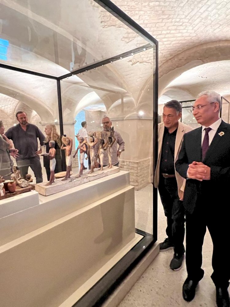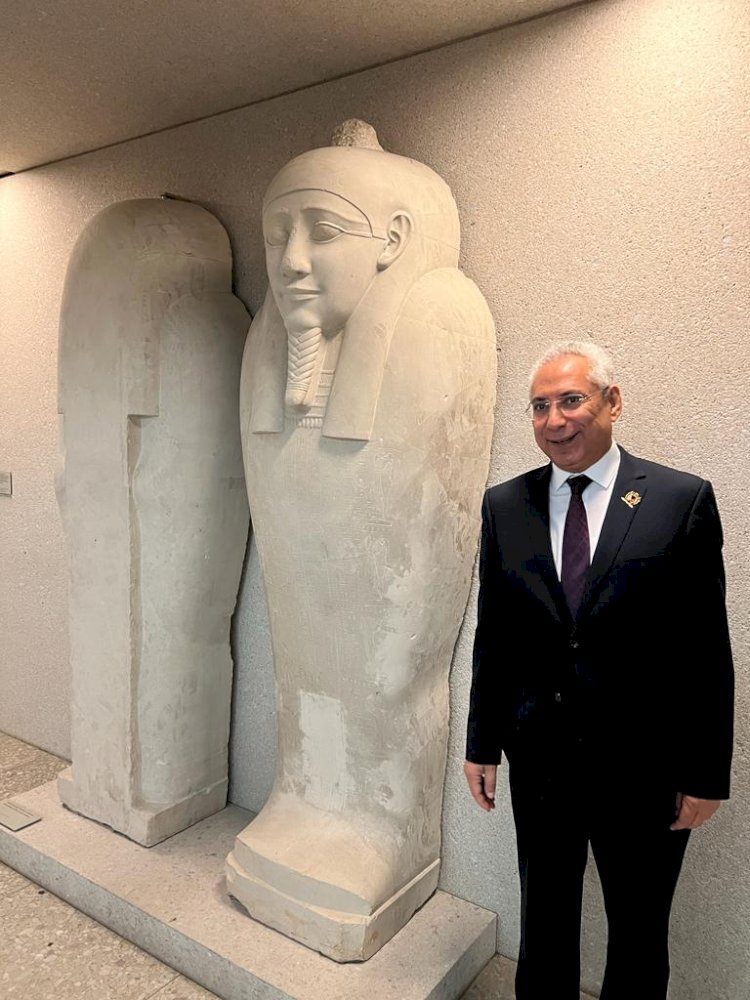 وتوقف د. عصام فرحات أمام تمثال الملكة نفرتيتي رمز وشعار جامعة المنيا، وأجمل ملكات الأرض، وزوجة الملك الفيلسوف أخناتون، وأحد أشهر الأعمال الأثرية المصرية القديمة؛ ليتأمل روعة التمثال ونسبه التشريحية، ومفرداته الجمالية، والذي يعتبر بمثابة أيقونة متحف برلين للآثار المصرية، ويمثل رمزاً ثقافياً، لتربعه على عرش الكنوز الفنية.