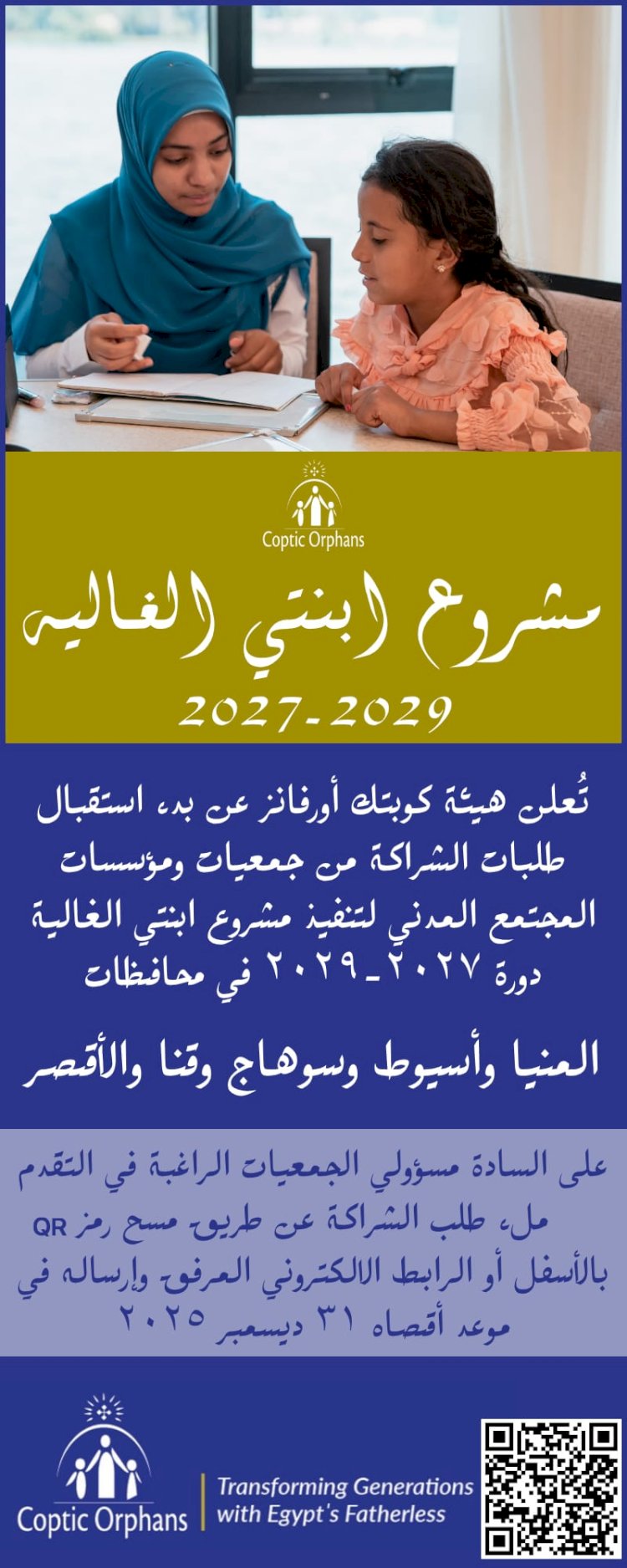 تُعلن هيئة كوبتك أورفانز عن البدء في استقبال طلبات الاشتراك في مشروع ابنتي الغالية والخاصة بالمدة من 2027-2029.