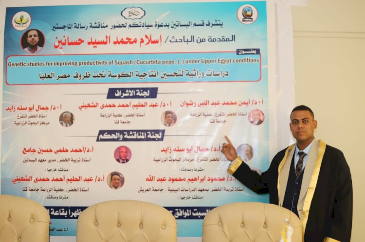 شهدت كلية الزراعة بجامعة قنا مناقشة رسالة الماجستير المقدمة من الباحث إسلام محمد السيد حسانين بعنوان: «دراسات وراثية لتحسين إنتاجية الكوسة تحت ظروف مصر العليا»، وذلك برعاية الأستاذ الدكتور أحمد عكاوي رئيس الجامعة، والأستاذ الدكتور محمد وائل عبد العظيم محمد نائب رئيس الجامعة لشئون الدراسات العليا والبحوث، والأستاذ الدكتور عبد العزيز شيبه عبد الرحمن عميد الكلية، والأستاذ الدكتور عبد الحليم الشعيني وكيل الكلية لشئون الدراسات العليا والبحوث، والأستاذ الدكتور مؤمن محمد الوصفي رئيس القسم.