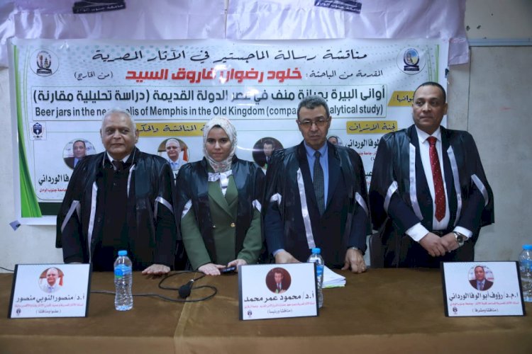 شهدت كلية الآثار بجامعة جنوب الوادي بقنا مناقشة رسالة الماجستير المقدمة من الباحثة خلود رضوان فاروق السيد، بعنوان: "أواني البيرة بجبانة منف في عصر الدولة القديمة (دراسة تحليلية مقارنة)". وجاءت المناقشة تحت رعاية الأستاذ الدكتور أحمد عكاوي، رئيس الجامعة، والأستاذ الدكتور وائل بكري رشيدي، عميد الكلية، والأستاذ أبو بكر عبد السلام مصطفى، وكيل الكلية لشئون الدراسات العليا والبحوث.
