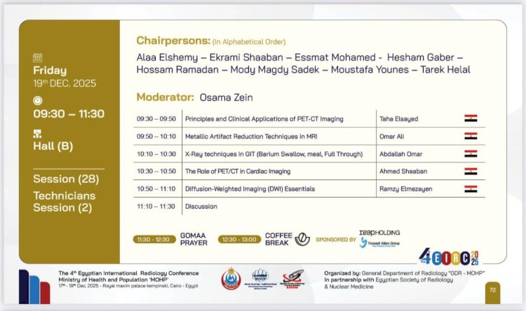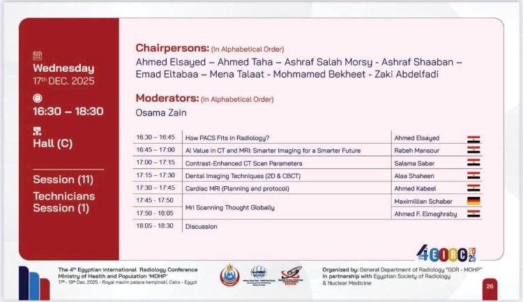 8- عمر علي، أخصائي تقنيات التصوير بالأشعة، مستشفى الشرطة بأسيوط، ويعرض "تقنيات وكيفية تحسين جودة الصورة وإصلاحها"، وذلك في حال وجود معادن داخل الجسم، خاصة في صور الرنين المغناطيسي.