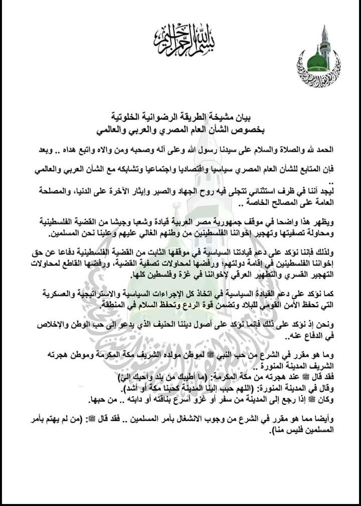 أصدرت مشيخة الطريقة الرضوانية الخلوتية بيانًا أكدت فيه موقفها الداعم للقيادة السياسية المصرية في الحفاظ على الأمن القومي للبلاد، ومساندتها لموقف مصر الثابت تجاه القضية الفلسطينية، ورفضها القاطع لمحاولات التهجير القسري والتطهير العرقي الذي يتعرض له الشعب الفلسطيني.