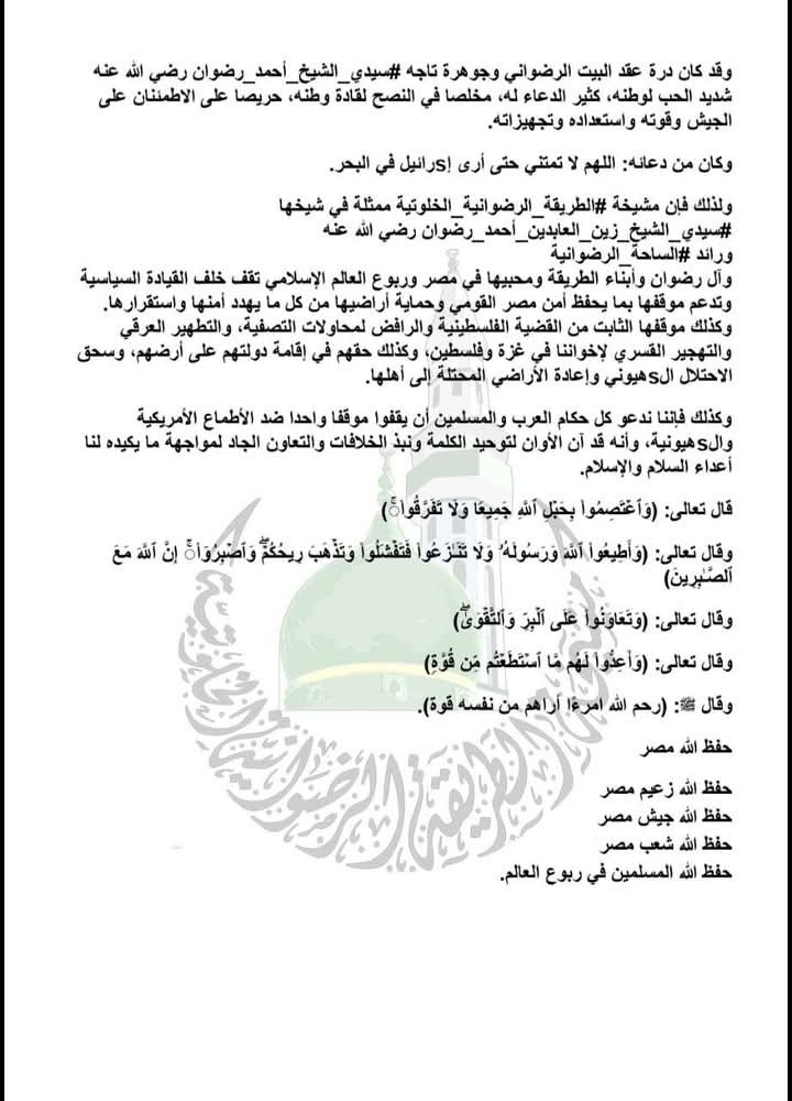 وأكدت المشيخة، ممثلة في شيخها سيدي الشيخ زين العابدين أحمد رضوان، ورائد الساحة الرضوانية، وآل رضوان وأبناء الطريقة ومحبيها في مصر والعالم الإسلامي، وقوفها خلف القيادة السياسية في اتخاذ كل الإجراءات السياسية والاستراتيجية والعسكرية التي تحفظ أمن مصر واستقرارها، وتضمن قوة الردع في مواجهة أي تهديدات تمس أمنها القومي.