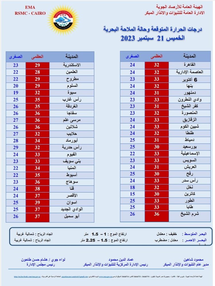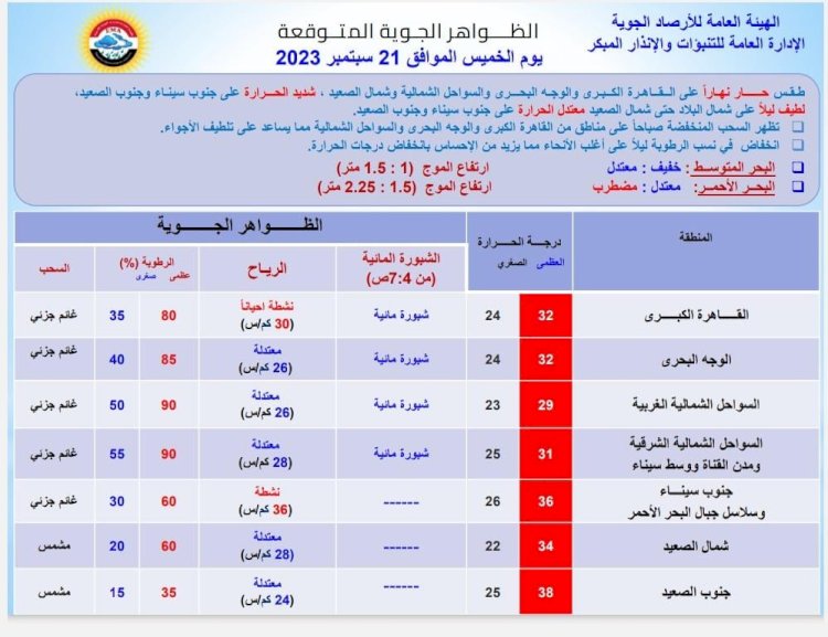 قالت هيئة الأرصاد الجويةإنها تتوقع أن يشهد اليوم الخميس استمرار انخفاض درجات الحرارة ليسود طقس حار نهارا على القاهرة الكبرى والوجه البحرى و السواحل الشمالية وشمال الصعيد، شديد الحرارة على جنوب سيناء وجنوب الصعيد ، لطيف ليلا على شمال البلاد حتى شمال الصعيد ، معتدل على جنوب سيناء وجنوب الصعيد