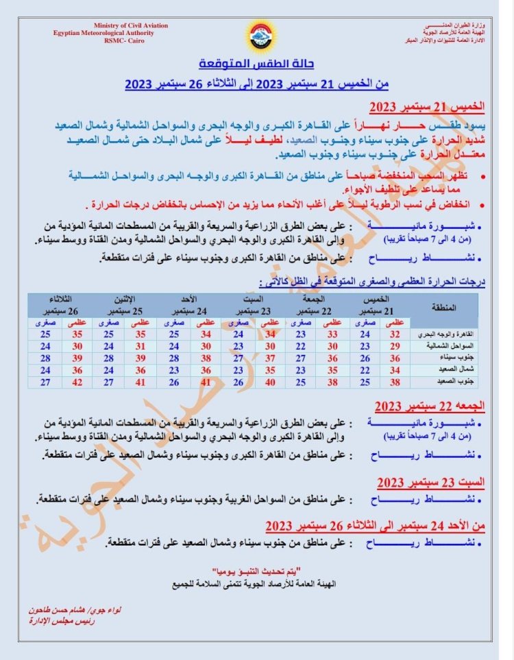 كما تتوقع هيئة الأرصاد، أن يشهد اليوم نشاط رياح على بعض المناطق، وشبورة مائية صباحا من الساعة 4 : 7 صباحا على بعض الطرق المؤدية من وإلى القاهرة الكبرى والوجه البحرى والسواحل الشمالية ومدن القناة ووسط سيناء وشمال الصعيد، وفرص أمطار خفيفة على السواحل الشمالية وشمال الوجه البحرى، كما تظهر السحب المنخفضة صباحا على مناطق من القاهرة الكبرى والوجه البحرى والسواحل الشمالية مما يساعد على تلطيف الأجواء .