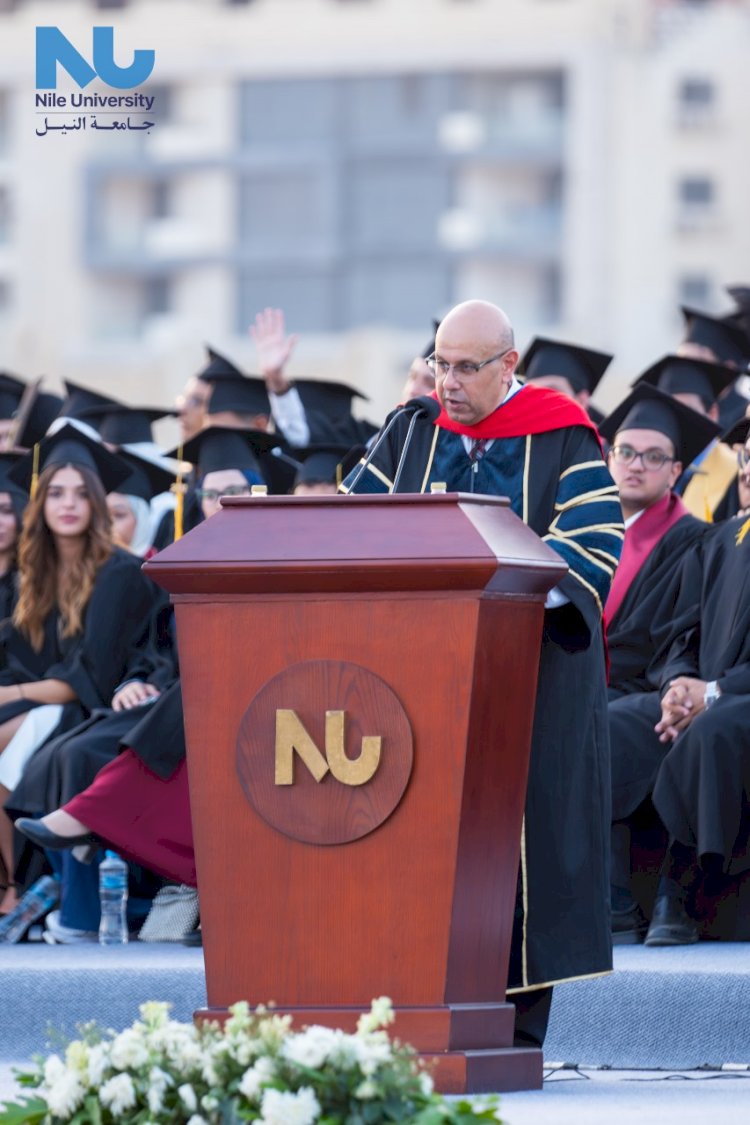وقال في كلمته أمام الخريجين بأننا بعد عامين تقريباً سوف تحتفل الجامعة بمرور عشرين عاما على تأسيسها وهي الفترة التي أثبتت الجامعة فيها تميزها وقدرتها على أداء رسالتها المتكاملة، وإذا كنا نتفاخر ببناء الهرم الأكبر في عشرين عاماً فإن ما نتفاخر به أكثر هو الإنسان المصري الذي شيد هذا البناء الخالد، وهكذا اليوم نبني الإنسان في جامعة النيل والذي يبني الحضارة بدوره لتتحدث عنه الأجيال.
