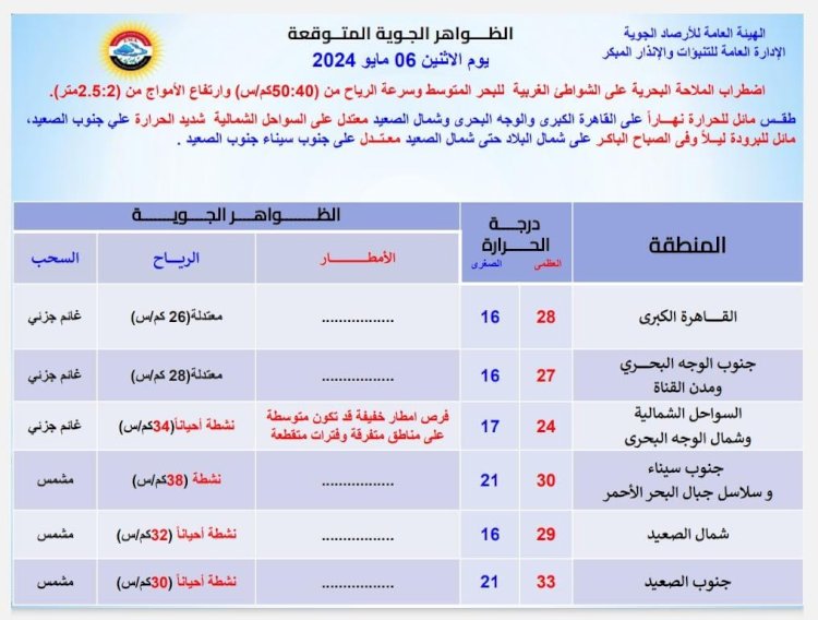 ومتوقع كذلك نشاط رياح على أغلب الأنحاء، واضطراب الملاحة على شواطئ البحر المتوسط وسرعة الرياح من 50: 60 كم فى الساعة وارتفاع الأمواج من 2: 3 متر، مع وجود فرص أمطار خفيفة إلى متوسطة على السواحل الشمالية وشمال الوجه البحرى.