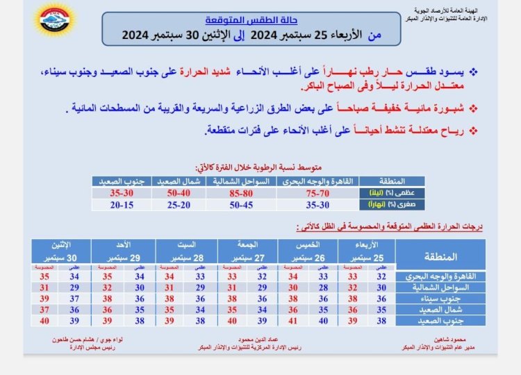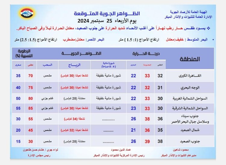 قالت هيئة الأرصاد الجوية إنها تتوقع أن يسود اليوم الأربعاء 25 سبتمبر 2024 طقس حار رطبًا نهاراً على أغلب الأنحاء شديد الحرارة على جنوب الصعيد، معتدل الحرارة رطب ليلًا.