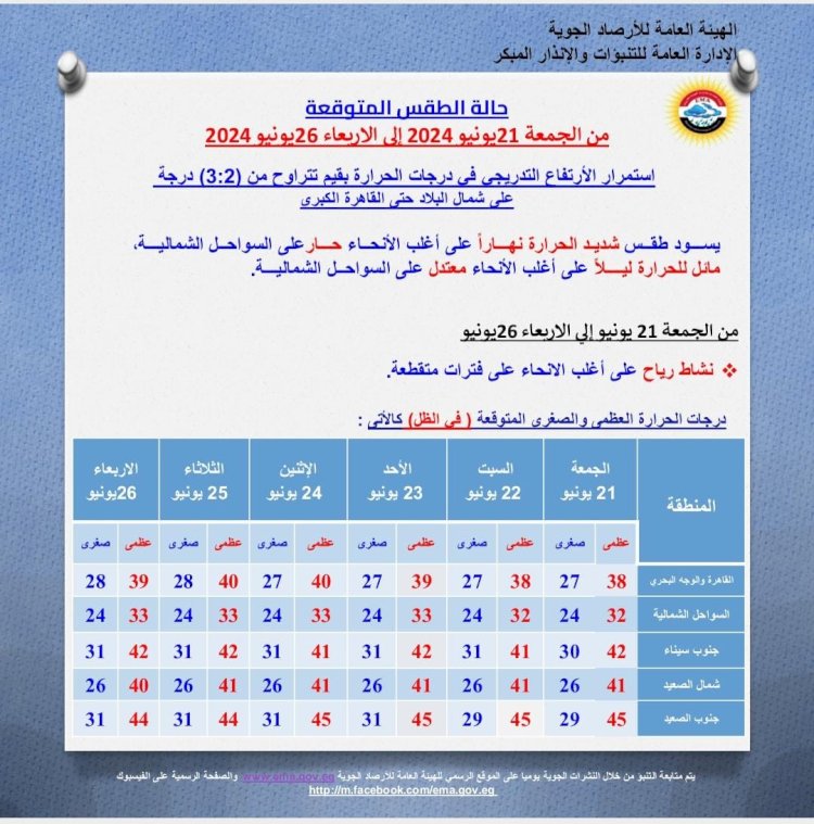 درجات الحرارة اليوم الجمعة 21 يونيو 2024 : القاهرة العظمى 38 درجة والصغرى 27، والإسكندرية العظمى 32 والصغرى 24، ومطروح العظمى 31 درجة والصغرى 23، وسوهاج العظمى 43 درجة والصغرى 27، وقنا العظمى 44 درجة والصغرى 30، وأسوان العظمى 47 درجة والصغرى 30.