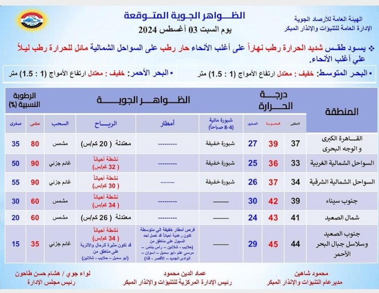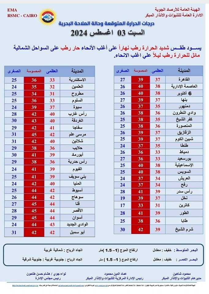 درجات الحرارة اليوم السبت 3 أغسطس 2024: القاهرة العظمى 37 درجة والصغرى 27، والإسكندرية العظمى 33 والصغرى 25، ومطروح العظمى 31 درجة والصغرى 25، وسوهاج العظمى 42 درجة والصغرى 26، وقنا العظمى 44 درجة والصغرى 27، وأسوان العظمى 44 درجة والصغرى 29.