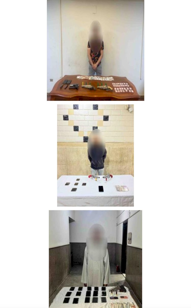 مديرية أمن دمياط ضبط ( 3 عاطلين "لإثنين منهم معلومات جنائية") ..وبحوزتهم (9 كيلو جرام لمخدر الحشيش – كمية لمخدر الهيروين – بندقية خرطوش - طبنجة – فرد محلى - عدد من الطلقات – دراجة نارية "بدون لوحات معدنية"). ضبط (عاطل "له معلومات جنائية") وبحوزته (8,500 كيلو جرام لمخدر الحشيش– 9 كيلو جرام لمخدر البانجو - بندقية آلية - عدد من الطلقات – مركبة تروسيكل بدون لوحات معدنية). مديرية أمن الإسماعيلية ضبط(عنصر إجرامى).. وبحوزته (8,500 كيلو جرام لمخدر الحشيش – دراجة نارية بدون لوحات معدنية). مديرية أمن الوادى الجديد ضبط(عنصر إجرامى "له معلومات جنائية").. وبحوزته (كيلو جرام لمخدر الحشيش – 60 قرص مخدر). مديرية أمن الجيزة ضبط(عاطلان).. وبحوزتهما (3 كيلو جرام لمخدر الحشيش – قطعة سلاح أبيض). ضبط(سائق "له معلومات جنائية").. وبحوزته (2 فرد محلى – طبنجة – عدد من الطلقات النارية – كمية لمخدر الهيروين – 2 سلاح أبيض). ضبط(عاطل).. وبحوزته (فرد محلى - عدد من الطلقات النارية – 1,500 كيلو جرام لمخدر الحشيش). مديرية أمن الشرقية ضبط(عنصرين إجراميين).. وبحوزتهما (2 كيلو جرام لمخدر الحشيش). ضبط(عنصر إجرامى).. وبحوزته (كمية لمخدر الحشيش- 2 فرد محلى وطلقتين). مديرية أمن المنوفية ضبط( 3 عناصر إجرامية "لهم معلومات جنائية").. وبحوزتهم (بندقية خرطوش وطلقتان – 1,300 كيلو جرام لمخدر الحشيش- كمية لمخدر الهيروين والآيس – 10 أقراص مخدرة –سلاح أبيض – ميزان حساس). مديرية أمن الأقصر ضبط(عنصران إجراميان "لهما معلومات جنائية").. وبحوزتهما (2 كيلو جرام لمخدر الحشيش- فرد محلى وطلقة). مديرية أمن شمال سيناء ضبط(عاطل).. وبحوزته (7 كيلو جرام لمخدر الهيدرو). هذا وتقدر القيمة المالية للمواد المخدرة المضبوطة بـ (2 مليون جنيه تقريباً). تم إتخاذ الإجراءات القانونية.