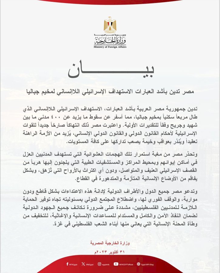 أدانت الخارجية المصرية بأشد العبارات اليوم الثلاثاء، الاستهداف الإسرائيلي الذي طال مربعا سكنيا في مخيم جباليا وأسفر عن سقوط ما يزيد على 400 مدني ما بين قتيل وجريح وفقاً للتقديرات الأولية، واصفة إياه باللاإنساني.